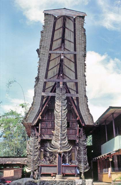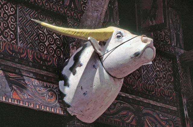 Decoration of traditional hose tongkonan. Number of horns of killed buffalos gives idea about richness of family. Tana Toraja area. Sulawesi,  Indonesia.