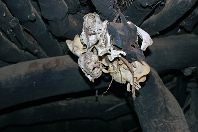 Skulls of dead animals are animistic fetishes against bad evils, Somba tribe. Boukoumbé area. Benin.