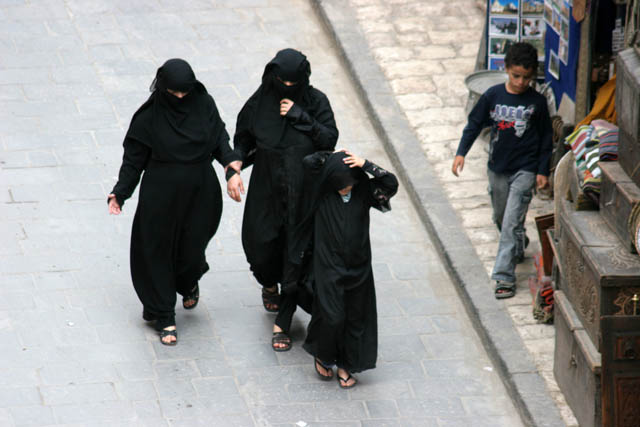 Women at traditional clothes at street at old quarter of Sana capitol. Yemen.